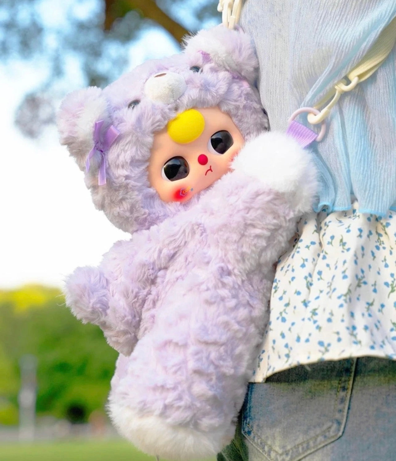 Adorable and rare Cureplaneta Baby Three Hugging Baby Backpack Plush (400%), perfect for collectors and fans of designer toys! 💜 This blind box collectible features Baby Three hugging a tiny backpack — a must-have for your collection.