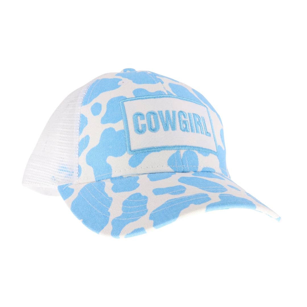 Show off your western spirit with this fun blue-and-white cow print ball cap. Featuring bold “COWGIRL” embroidery and a breathable mesh back, it's perfect for sunny days, country concerts, or adding a playful touch to any casual look.